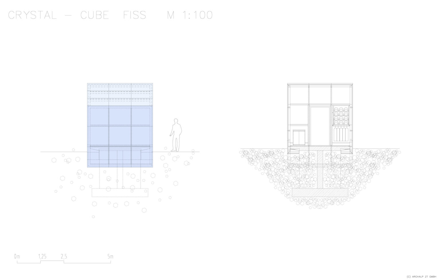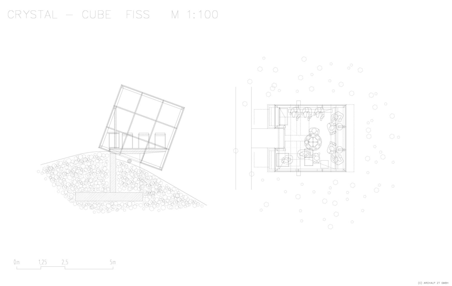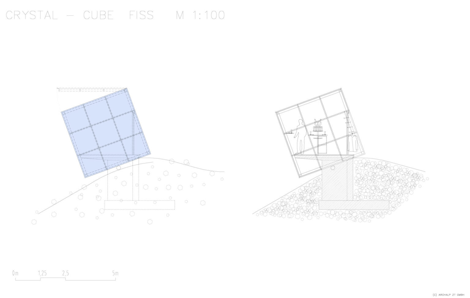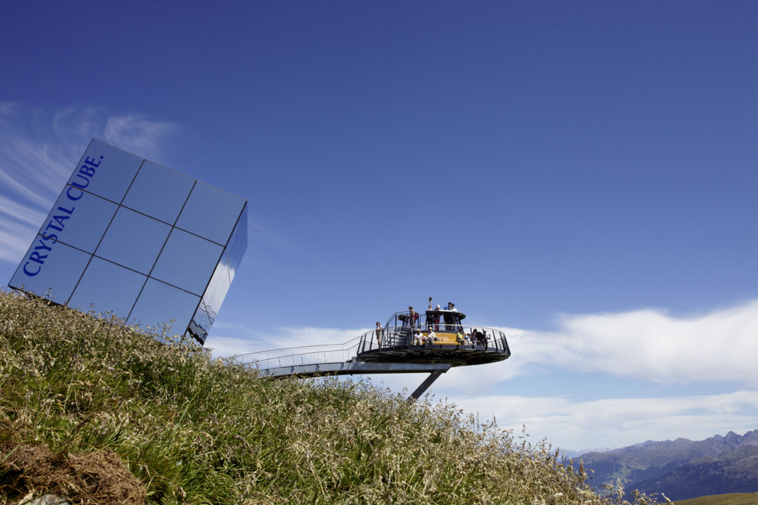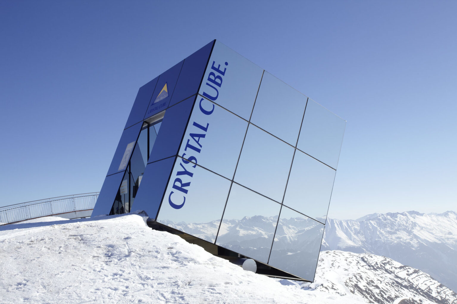 Der Crystal Cube vermittelt den Eindruck, er würde, auf einem Rundholz gelagert, den Berghang hinab rollen. Die umgebende Berglandschaft, spiegelt sich in seiner Glashülle und lässt ihn, je nach Blickwinkel, mit seiner Umgebung „verschmelzen“. Er ist ein markantes „Landmark“ auf 2.600 Meter Höhe und kann für diverse Veranstaltungen gebucht werden.