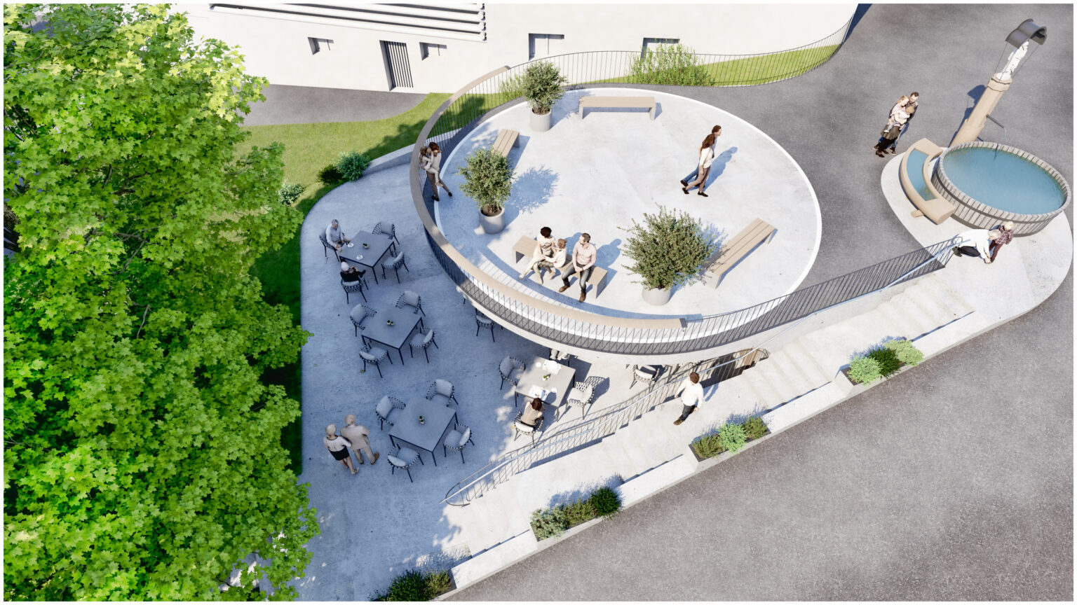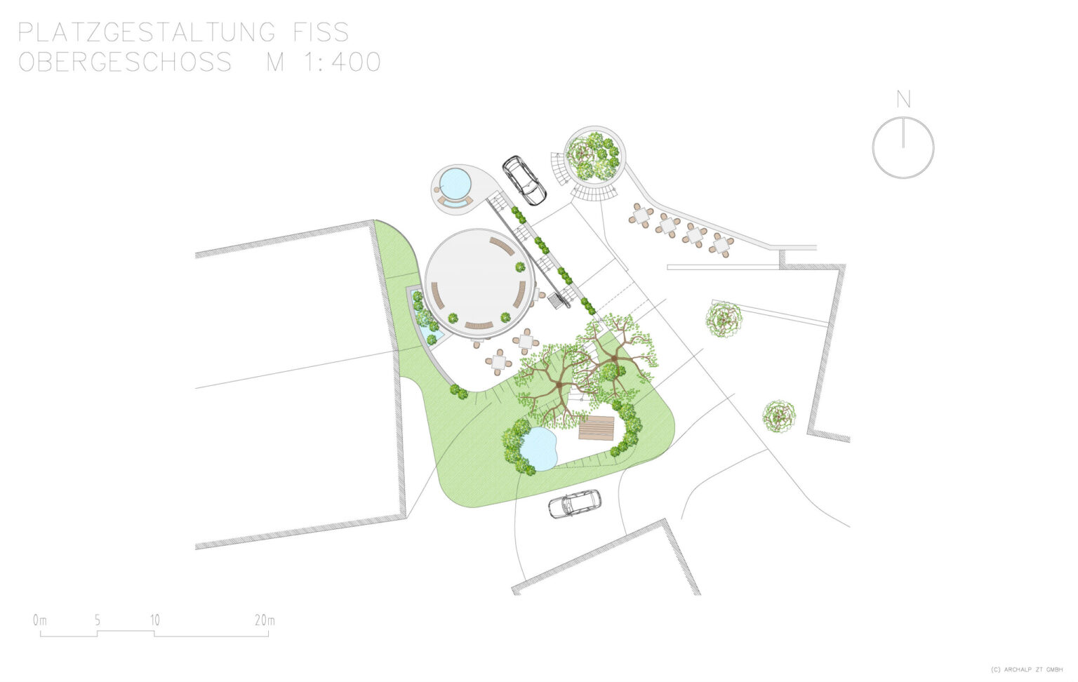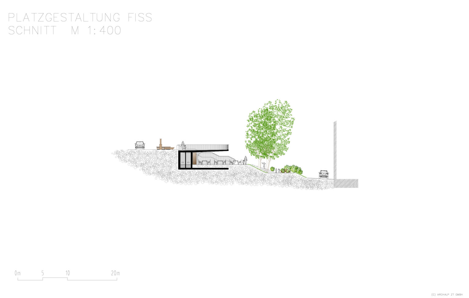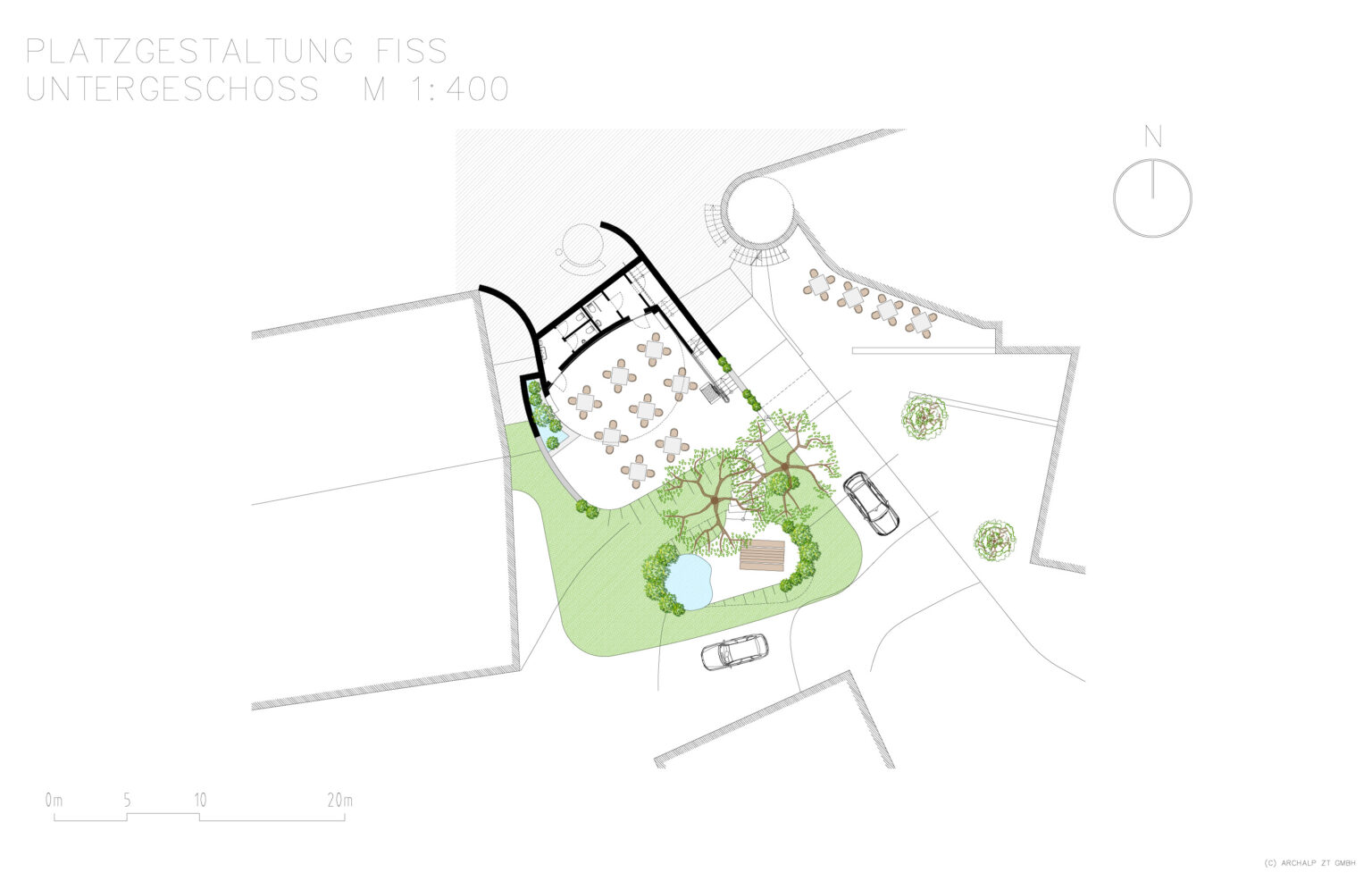 Für die Gemeinde Fiss wurde eine Platzgestaltung visualisiert, welche mehrere Nutzungen an einem Ort vereint. In Hanglage sollte ein teilöffentlicher Platz entworfen werden, welcher als überdachter Gastgarten einer nahegelegenen Gaststätte genutzt werden kann. Bei Bedarf soll die gesamte Anlage für öffentliche bzw. kulturelle Veranstaltungen genutzt werden können. Der vorhandene Dorfbrunnen und die beiden großgewachsenen Bäume wurde in das Gesamtkonzept nahtlos eingebunden.
