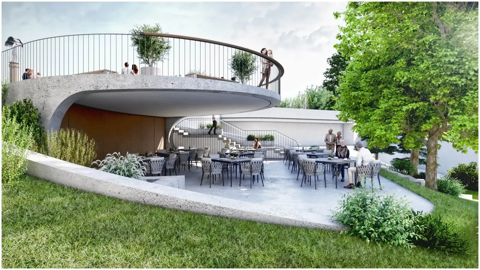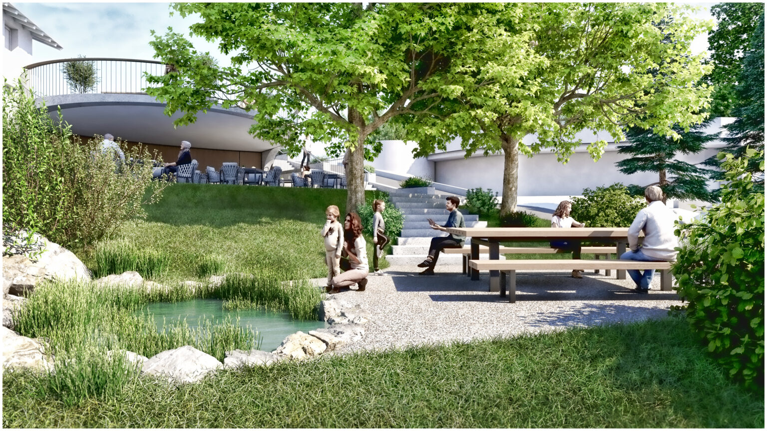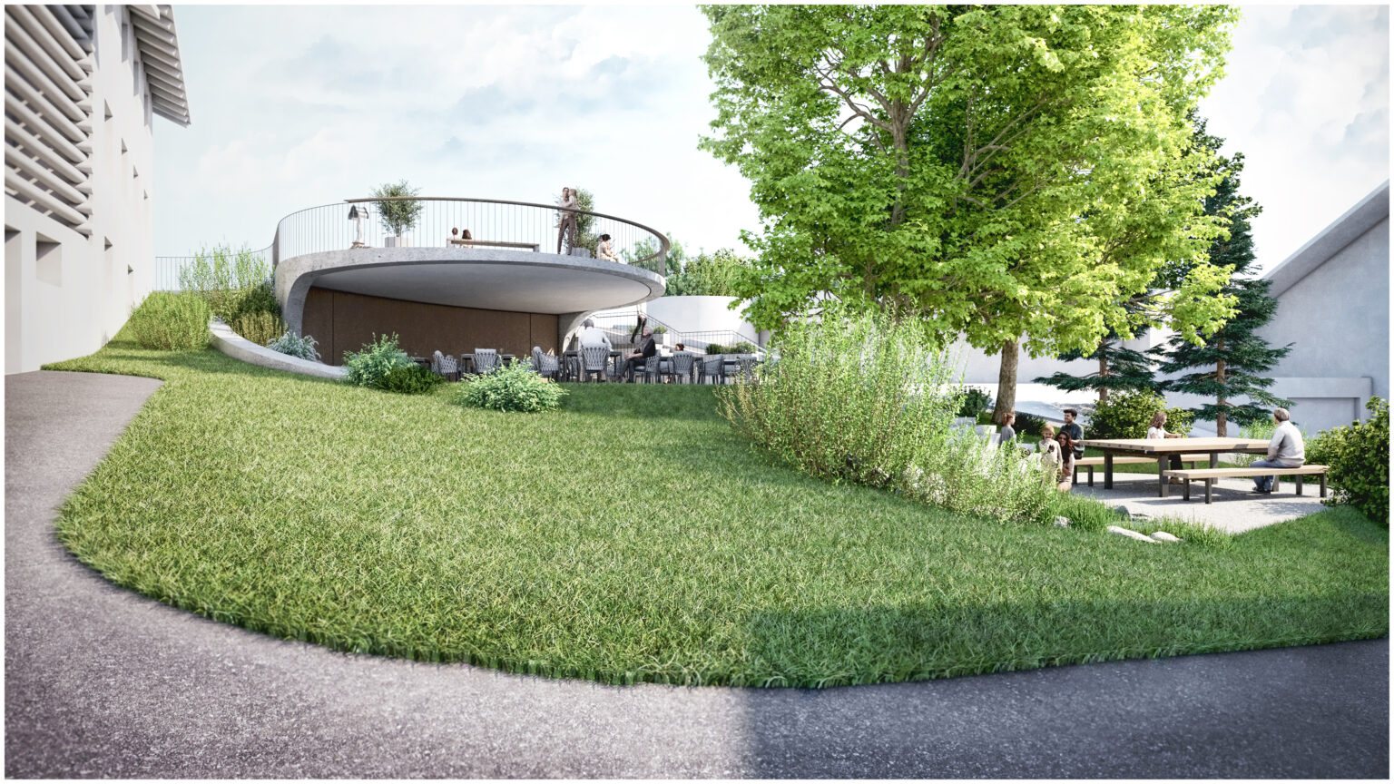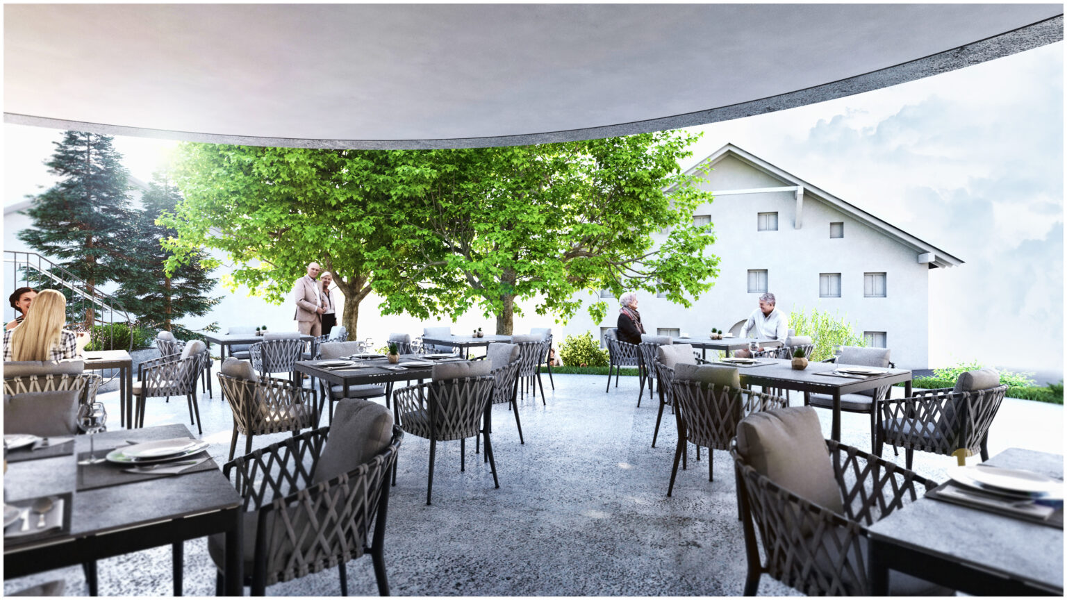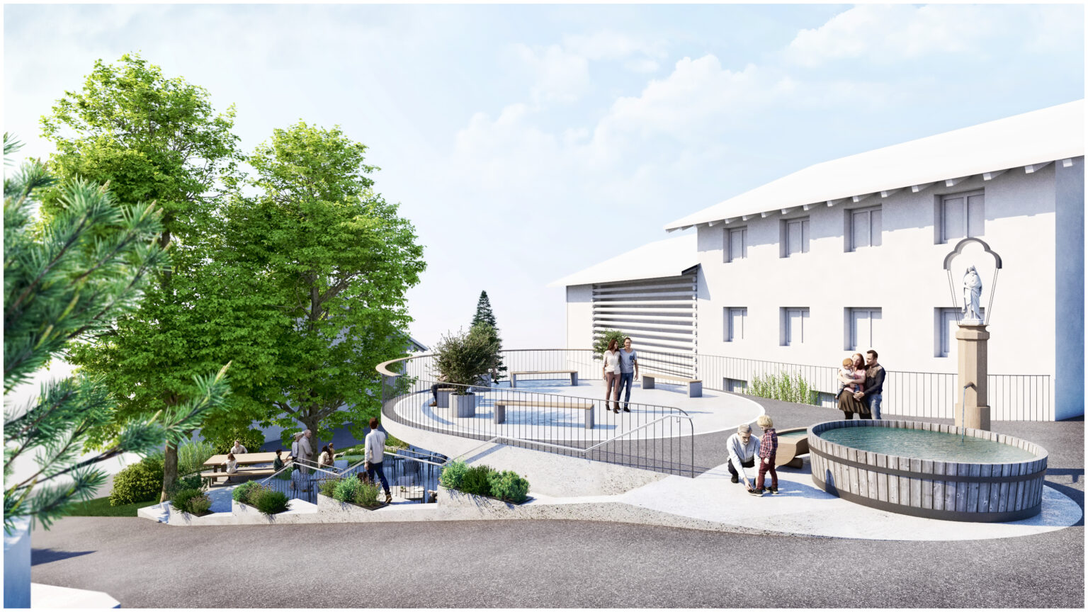 Für die Gemeinde Fiss wurde eine Platzgestaltung visualisiert, welche mehrere Nutzungen an einem Ort vereint. In Hanglage sollte ein teilöffentlicher Platz entworfen werden, welcher als überdachter Gastgarten einer nahegelegenen Gaststätte genutzt werden kann. Bei Bedarf soll die gesamte Anlage für öffentliche bzw. kulturelle Veranstaltungen genutzt werden können. Der vorhandene Dorfbrunnen und die beiden großgewachsenen Bäume wurde in das Gesamtkonzept nahtlos eingebunden.